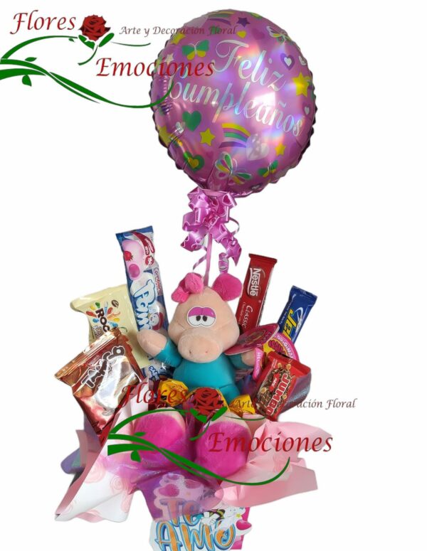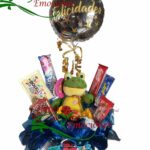 Hermoso arreglo con dulces variados, globo y peluche