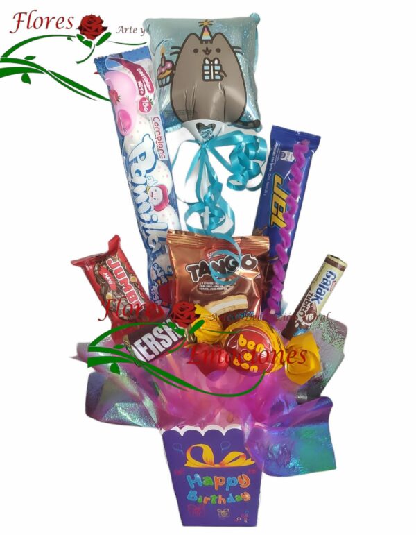 Hermoso arreglo con dulces variados, globo